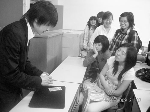 每個周日下午,魔術(shù)社宣傳部的成員都會到學(xué)校文科樓找間空教室,在黑板上寫下:“7:00魔術(shù)社活動”,然后發(fā)短信通知各個社員準時到場。6點半以后,帶著道具的社員們接踵而至。人來得差不多了,活動就開始。先是讓兩三個新手上臺表演上次活動學(xué)過的魔術(shù),有的新手下去沒有時間好好練習(xí),一上臺表演就緊張,新手出了錯,底下笑成一團。