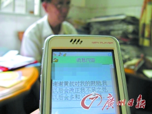 本報(bào)訊 (記者曾毅攝影報(bào)道) 今年74歲,曾任順德區(qū)人大代表的黃其廠老人,昨天終于等來了一條期盼多日的短信,“謝謝黃叔對我的鼓勵(lì),我以后會(huì)改正我不足之處,以后多和父母溝通!