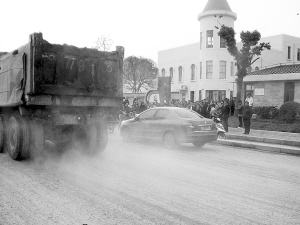 顧北東路是一條新建馬路,寬敞平坦,但一過富聯(lián)路,往東到顧村中心幼兒園門口就中止了,成了一條斷頭路,盡頭就是這個(gè)大型車停車場的唯一“入口”。每天,土方車、集卡、垃圾車來來往往川流不息,車輪帶出的泥土將顧北東路弄得到處是泥。車輛一過,塵土飛揚(yáng),如刮沙塵暴;雨天,水泥路成了泥漿路,人們稍不留神就會摔跤。