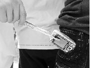 長(zhǎng)20~30厘米,狀如普通鑷子,但兩腿末端扁平,很像鴨嘴!傍喿臁苯(jīng)過小偷再加工,咬合力和摩擦力加強(qiáng)。探進(jìn)衣兜后,因尖端圓鈍,不會(huì)扎住人,很難發(fā)覺。“鴨嘴鑷”專門用來夾錢包。