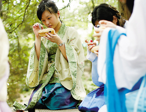本報訊 (記者 沈軼倫 實習生 顧薇)昨天,民間社團“漢未央”在中山公園組織了一場七夕乞巧祈福活動。女孩們身著漢服,頭戴金釵,模仿古人開展七夕乞巧祈;顒。
