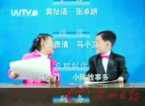 在《幼聞聯(lián)播》中,我們看到了與央視《新聞聯(lián)播》幾乎相同的畫面,左上角標著臺標“UUTV”,下方畫面從左到右分別寫著:“中國幼兒電視臺”、“幼聞聯(lián)播”及日期。畫面正中,正襟危坐著男女小主播“張卓妍”和“黃祉語”。在與《新聞聯(lián)播》相同的開場白后,兩個小主播開始播報新聞簡介,接著畫面轉(zhuǎn)向了由幼兒園小朋友們拍攝的“新聞畫面”,有紅豆幼兒園園長會見白豆幼兒園園長噢·斑馬,雙方簽訂《紅白聯(lián)合聲明》;有幼兒園怎樣預(yù)防H1N1流感……在播放《我園小朋友玩具船被搶,對方身份不明》新聞時,還非常專業(yè)地回放了監(jiān)控錄下的“搶劫”現(xiàn)場畫面,用圓圈標識可疑人物。更搞笑的是,新聞播報結(jié)束后,兩個小主持居然也像央視主持人般,拿起桌上的新聞稿一邊整理一邊互相交談,而后邊的字幕也很“央視”,“記者”包括了白小松、韓小生、敬小丹等。