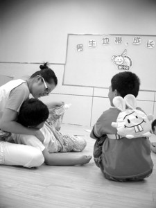第一課的主題是 “特別的禮物——成長話題”。老師高偉偉說,只有很特別的人才能參加這個特別的夏令營,要求孩子們一起做游戲,驗證自己是不是有資格來談?wù)撨@個特別的話題。第一個游戲是“做一個自己”,每個人得到一個用大海報紙做成的男孩輪廓,需要他們填完整,使這個男孩代表自己。第二個游戲要求孩子們根據(jù)指令行事,模仿對應(yīng)年齡層的表現(xiàn)。“媽媽,喝奶! ”一個男孩躺在地板上,學(xué)嬰兒討奶喝,把其他男孩逗得哈哈大笑。 “我們就是從小娃娃開始,成長為現(xiàn)在的男子漢。恭喜你們,有資格討論成長話題是長大的標(biāo)志! ”高老師說。通過這個游戲,孩子們知道,談?wù)摮砷L話題是8歲以上孩子的特權(quán)。