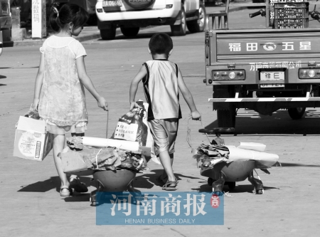 金水區(qū)柳林村西頭菜市場(chǎng),不少商戶都趴在柜臺(tái)上打盹。兩個(gè)孩子的到來(lái),打破了這份寧?kù)o……