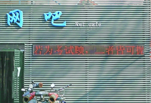 “聊天誠(chéng)可貴,游戲價(jià)更高,若為考試故,兩者皆可拋!边@首改編自裴多菲名句的打油詩(shī),在臨近期末考試時(shí),“登”上了舟山東路旁一家網(wǎng)吧門口的滾動(dòng)顯示屏,不過(guò)網(wǎng)吧不小心把“故”錯(cuò)寫成了“顧”。這幾天,有些學(xué)生考完打算回家,網(wǎng)吧老板同步又打出“祝同學(xué)們合家快樂(lè),虎年虎虎生威”的字樣,“歡送”學(xué)生返家過(guò)年。 周瑾 葉玉躍 李翔 攝