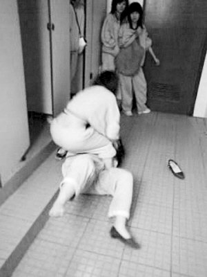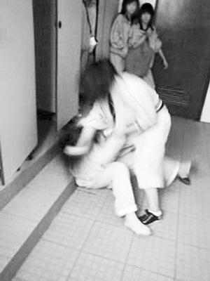 殷瓊是上海西南工程學校一年級學生。4月16日下午,她參加考試,題目差不多做完了,同學小成對她耳語:“下課去校門口,有人找你談話!币蟓倹]答應,小成幫她交卷,把她拉到校內(nèi)一幢大樓2樓女廁所門前,那里還有幾個女生在等著。拉扯進廁所后,另一名同學劉幸一邊拍她肩膀挑釁,一邊讓其他女生打開手機攝錄。視頻記錄了殷瓊的噩夢,殷瓊的母親向記者出示了這段影像: