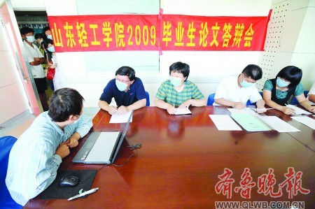 24日上午9點(diǎn)45分,一條標(biāo)有“山東輕工學(xué)院2009畢業(yè)生論文答辯會(huì)”的紅色橫幅掛在山大二院血液科會(huì)議室里,山輕工食品與生物工程學(xué)院的五位老師戴著藍(lán)色口罩一字排開,坐在一張長條桌的一側(cè)。張萍穿著住院服,戴著口罩在同學(xué)彭愛琴的攙扶下來到會(huì)議室。