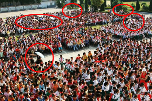 新學(xué)期開學(xué)后的一天下午,時(shí)值“秋老虎天氣”,氣溫達(dá)到三十四度,濱海縣實(shí)驗(yàn)小學(xué)兩千余名小學(xué)生服裝整齊地聚集在烈日下的大操場上舉行秋學(xué)期開學(xué)典禮。次日,該縣教育網(wǎng)站發(fā)了題為《濱?h實(shí)驗(yàn)小學(xué)舉行2009年秋季開學(xué)典禮》的報(bào)道,隨文還配發(fā)了三幅圖片,其中有一圖片顯示,密密麻麻的學(xué)生方陣中,約有十位女教師打傘防曬。