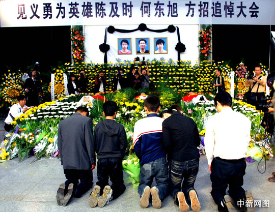 上午的追悼會由荊州市委副書記傅立民主持。長江大學(xué)黨委書記張忠家在悼詞中說,三名19歲的大學(xué)生為搶救他人生命,卻不幸離我們而去。我們?yōu)橹矗瑸橹袆。陳及時、何東旭、方招同學(xué)舍己救人的事跡震撼了古城、感動了全國!幾天以來,學(xué)校師生和社會各界人士,以多種方式表達崇敬和哀思。他們的英雄壯舉是良好的家庭教育、學(xué)校教育、社會教育和自我教育的結(jié)果。