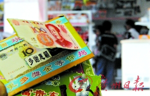 記者了解到,孩子們購買的“地下彩票”(見上圖,記者于濤攝)全都是5角一張。有的上面印著人民幣圖案,刮開后是什么面值的鈔票就能得到多少錢,有的就只能換到小玩具。眼看到了上學(xué)時間,孩子們還在不停地刮獎。