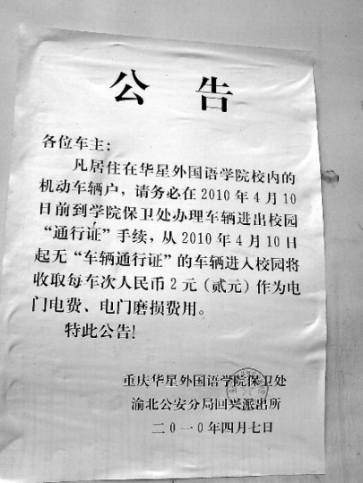 “我們住戶和學(xué)校完全是兩個(gè)獨(dú)立個(gè)體,學(xué)校根本沒(méi)有任何權(quán)力向我們收費(fèi)!奔易∪A星外國(guó)語(yǔ)學(xué)院家屬樓1單元5樓的住戶龍兵生說(shuō),本月7日,學(xué)校保衛(wèi)處在大門(mén)口通報(bào)欄處貼了一則收費(fèi)公告,要求凡居住在校內(nèi)有機(jī)動(dòng)車(chē)輛的住戶務(wù)必在本月10號(hào)前到學(xué)院保衛(wèi)處辦理進(jìn)出“通行證”手續(xù),否則將向進(jìn)出校園的無(wú)“車(chē)輛通行證”的住戶,收取每人每車(chē)次2元,作為電門(mén)電費(fèi)、電門(mén)磨損費(fèi)用。