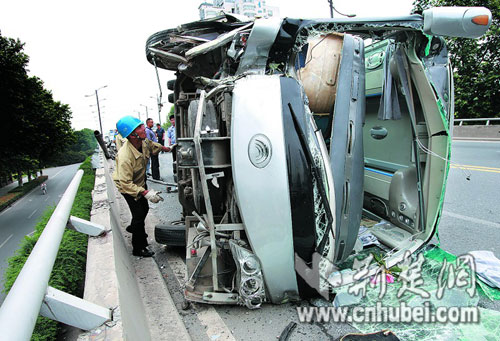 荊楚網(wǎng)消息 (楚天都市報(bào)) (記者許洋)昨日11時(shí)55分,一輛滿載35名大學(xué)師生的大客車行至青山建設(shè)五路立交橋時(shí),與一輛同向行駛的轎車發(fā)生碰撞,客車側(cè)翻在立交橋橋面上,約有6名學(xué)生出現(xiàn)腦外傷、骨折。