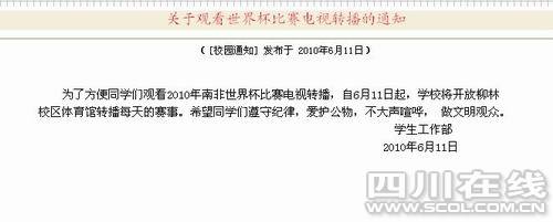 西財(cái)在校學(xué)生小徐在本報(bào)大成網(wǎng)新聞報(bào)料臺(tái)轉(zhuǎn)發(fā)了這則通知:“2010年南非世界杯開幕在即,世界杯比賽期間正值國家英語四六級(jí)考試和期末復(fù)習(xí)考試階段,為了維護(hù)學(xué)校的正常教學(xué)和生活秩序,確保同學(xué)們能夠正常的休息,以良好的狀態(tài)溫課迎考,應(yīng)廣大同學(xué)和學(xué)生家長的要求,學(xué)校決定自6月11日起至賽事結(jié)束,學(xué)生公寓熄燈以后校園網(wǎng)絡(luò)也將暫停使用!