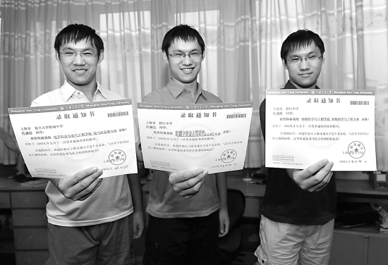 暑假里,三兄弟已經在為大學的學習做準備了。英語是“必修課”,三人都在努力背大學英語四級單詞。老二高考加試的是化學科目,“高三一年,物理學得少。到了大學,我們機械工程專業(yè)肯定有大量物理的內容,所以我得趁假期好好溫習物理 ”。與他相反,老三高考加試了物理,而他在交大念的是材料科學專業(yè),“材料科學一定有許多化學知識,我得抓緊補”。(記者 徐敏)