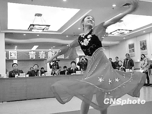 8時10分,面試開始,第一個上場的陳曉琴做了簡單的自我介紹,大屏幕顯示她抽中的問題是:如何能做一個合格的軍人。陳曉琴說,要做一名合格的軍人不但要嚴(yán)明紀(jì)律、聽從指揮,還要團(tuán)結(jié)同志。接著她表演了跆拳道,并拿下了北京市女兵面試的第一個分?jǐn)?shù)——26分,全部考試,陳曉琴用了8分鐘。 8時50分,來自民族大學(xué)舞蹈學(xué)院的5號應(yīng)試者朱瑜上場了;卮鹆讼嚓P(guān)的問題后,她拿出了一把藍(lán)色的綢扇,跳起了一套她自編的舞蹈,婀娜的舞姿征服了全場的觀眾,也征服了9位評委,她得了28.57的高分,這個分?jǐn)?shù)也是海淀考區(qū)全天考試的最高分。與她同樣得了最高分的還有清華大學(xué)的王曉麗。