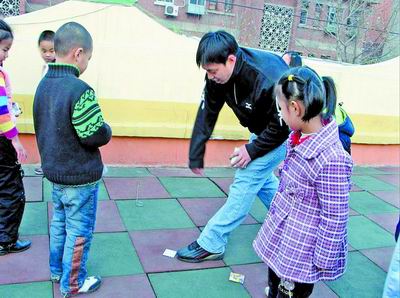 而在“玩”的時(shí)候,男女老師的不同就會(huì)顯現(xiàn)而出。據(jù)介紹,女老師一般是和孩子們玩一些如丟手絹之類活動(dòng)量較小的游戲,而男老師就會(huì)帶著孩子們玩一些活動(dòng)量較大的項(xiàng)目,比如競(jìng)技賽跑等!澳欣蠋煄У陌嗌系暮⒆訒(huì)比較‘瘋’,這是我們?cè)敢饪吹降,孩子充滿活力是件好事!眲⒚麝栒f。