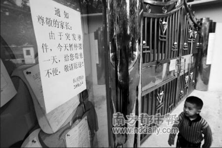在公開信的邊上還貼著一份機關(guān)四幼的通知,稱“由于突發(fā)事件,今天暫停課一天”。在這份通知的左下角,有人用圓珠筆歪歪扭扭地寫下了不滿:“家長要求退還所有費用,到其他學(xué)校上學(xué)!