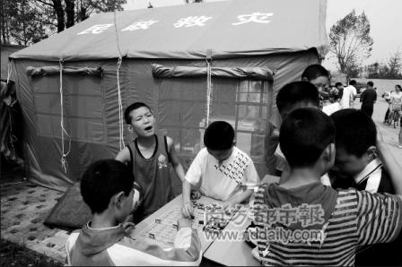 19日10時30分:谷勝聰坐在初一教學(xué)部的電腦前,15平方米大的帳篷里坐著近10名老師。檢查過記者的證件后,谷勝聰拿出一包潤喉糖,拿出一顆后又塞進包里。