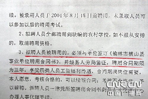 雷波說,他參加工作后,日子越過越窮,孩子感冒都不敢去醫(yī)院治療。類似雷波的遭遇,在180名選聘教師的每個(gè)人身上都上演著。從4月2號開始,這些教師紛紛丟下學(xué)生,到橫山縣人民政府討說法。橫山縣人事和勞動社會保障局辦公室的工作人員稱,當(dāng)初的考試是為解決中專生就業(yè)而進(jìn)行的,雷波等人屬于民辦教師,難以做到與中專生同工同酬。