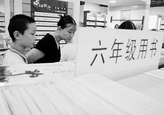 “今天來買書的家長已經少多了!苯逃龝暌幻ぷ魅藛T說,買書的高峰是8月31日和9月1日,“31日下午人最多,收銀臺前排隊的人都圍著書架繞了兩圈,足足有100多個。1日因為是周一,家長都要上班,所以晚上人最多。”