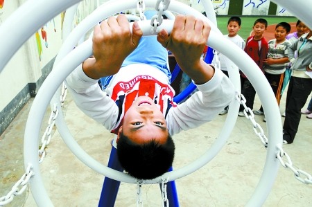 五年級的小學(xué)生徐成林排隊坐在一個名叫“過山環(huán)梯”的器材上,面朝上躺下,然后憑著手和腳的力量在環(huán)形的器材里,像只小蟲一樣蠕動前進(jìn)。