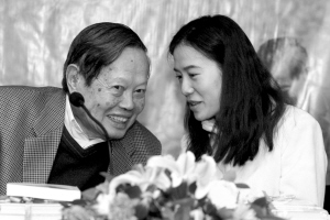 首發(fā)式上,楊振寧身著西服精神矍鑠,翁帆穿白色上衣溫婉大方。夫婦雙雙坐定面向讀者時,全場響起熱烈的掌聲。在隨后的活動中,翁帆除了充當楊振寧的“耳朵”,偶爾為他重復讀者、媒體的問題外,倘若沒問到自己頭上,基本一言不發(fā),關注著楊振寧及其他嘉賓的講話。聽到楊振寧發(fā)表的觀點與見解后,時而點頭稱贊,時而頷首微笑。
