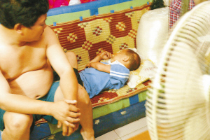 16歲的大女兒也已起床。對(duì)大女兒,陳彩霞很放心,因?yàn)樗犜、懂事,而且已?jīng)能為家里掙錢了。讓她揪心的是9歲的兒子淘淘。和名字一樣,兒子淘氣得讓她有時(shí)候覺得很窩火。這時(shí)候,淘淘還蜷在沙發(fā)上睡覺,那是他的床。