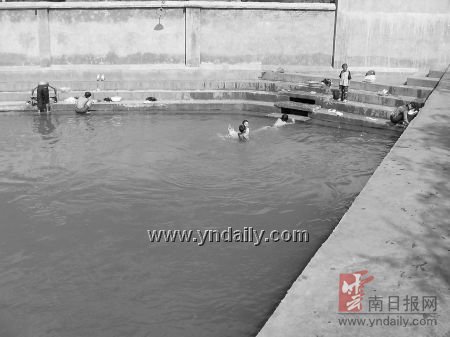 滇南武校內(nèi)有一個(gè)游泳池,但多年未用,泳池成了學(xué)生晾曬衣服的場(chǎng)地。游泳池的南側(cè)還有一池子,池內(nèi)的水就是從校外公路邊引來的龍?zhí)端。池子的北面是走道,地面高出水面約150厘米。池子的東、南、西3面都有臺(tái)階下到池底,學(xué)生們可以在這里洗衣服,當(dāng)然,練武的學(xué)生們也會(huì)在課后站到不深的池內(nèi)擦擦身子。