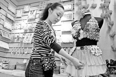 昨日,沙坪壩,老板娘正在整理用安全套做的衣服 吳珊 攝