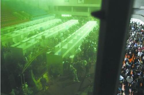 雖然擁有高達(dá)9%的年經(jīng)濟(jì)增長率,但國內(nèi)商業(yè)、服務(wù)業(yè)所能提供的就業(yè)崗位仍不能滿足每年新增的就業(yè)需求。知識(shí)型勞力過剩的情況不能避免的出現(xiàn)了。求職中的學(xué)生們來不及考慮這些,他們西裝革履,他們擠出微笑,簡歷中的寸照與期待的面孔疊在一起,等待著命運(yùn)的垂青。(程啟凌)