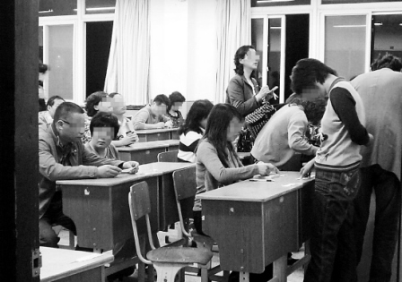 教學(xué)點(diǎn)的墻上貼著一些學(xué)生的進(jìn)步成績(jī)表,一名男咨詢員指著其中一個(gè)高三學(xué)生的名字說(shuō),這個(gè)孩子全科補(bǔ),不在學(xué)校晚自習(xí)了,家長(zhǎng)為此已投入7 萬(wàn)多元!盀榱撕⒆拥膶(lái),投入還是值得的!彼f(shuō),“孩子在學(xué)校晚自修效率不高,學(xué)校老師要管很多學(xué)生,如果你孩子不主動(dòng),老師也很難顧及到!