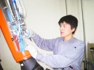 車(chē)間的流水線(xiàn)突然發(fā)出報(bào)警,機(jī)器人隨之停止工作。4月10日上午10時(shí),楊雪峰正坐在中控室監(jiān)視流水線(xiàn)運(yùn)轉(zhuǎn),面前的紅燈閃個(gè)不停。他拎起工具包,和師傅跑到報(bào)警機(jī)器前。一個(gè)兩米多高的機(jī)器人“罷工”了。“這個(gè)機(jī)器人是專(zhuān)給車(chē)身噴漆的,它一停,整個(gè)流水線(xiàn)就不能運(yùn)轉(zhuǎn)了!睏钛┓蹇刂谱⌒睦锏木o張,緊握扳手的右手有些微微顫抖,爬上流水線(xiàn)和師傅一起查找原因,“進(jìn)廠(chǎng)后就沒(méi)修過(guò)機(jī)器人這個(gè)大家伙,在師傅身后學(xué)了半年,這回終于派上用場(chǎng)了!