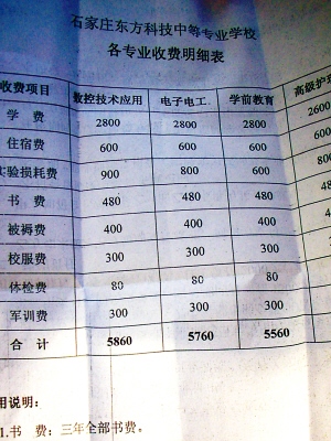如果學生想自己找實習單位,就要交3000元錢。其中1000元是注冊費,2000元是伙食費。“我們是與石家莊協(xié)和醫(yī)學院聯合辦學的,發(fā)的是那所學校的畢業(yè)證,注冊什么的都需要錢,這個錢就得學生來出!边@位老師說,從去年5月份開始,學校的食堂就對學生和教職工免費開放了。小張去年7月從廣東打工回來,暑假后來上學,從9月到現在,在學校免費吃了7個月的飯,按每月300元算,是2100元,學校收2000元是合適的。