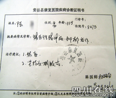 11月6日上午,安岳縣長(zhǎng)河源中學(xué)校長(zhǎng)謝培忠一直守在辦公室電話機(jī)前,他不停地抽著煙。直到中午放學(xué),謝培忠所期盼的電話一個(gè)都沒(méi)等到。按縣教育局最新發(fā)出的文件規(guī)定,他們學(xué)校離校治“精神病”的8名中青年骨干老師,年底前必須返校復(fù)查。可是現(xiàn)在的情況是,這些老師大多數(shù)都和學(xué)校失去了聯(lián)系,最長(zhǎng)的已經(jīng) 6年沒(méi)有了消息……