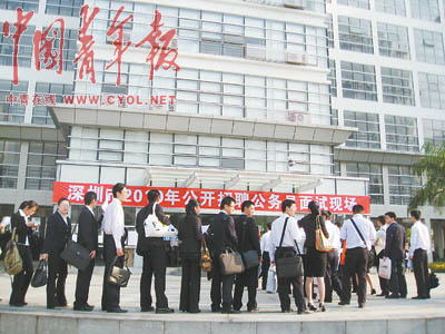 23歲的鐘文去年從深圳大學(xué)法學(xué)專業(yè)畢業(yè),她報考的是深圳市坪山新區(qū)執(zhí)法員的職位。和鐘文一樣來參加面試的考生有1036人,是從34545名考生中通過筆試篩選出來的“幸運兒”。今天,他們將經(jīng)歷又一次殘酷競爭——只有346人能最終進(jìn)入深圳的聘任制公務(wù)員隊伍。