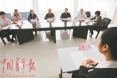 早上8點半,一百多名考官已經(jīng)在考場三樓的階梯教室等待抽簽。此時的一樓,1000多名考生已經(jīng)排隊簽名進(jìn)場候考。每個人面試的時間都是12分鐘,由于面試成績在總成績中占40%,因此,這12分鐘將在很大程度上決定面試者的未來。
