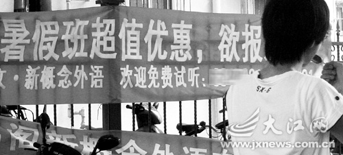 14日11時許,記者來到南昌市疊山路與蘇圃路交界處,不少懷抱各種宣傳單的宣傳員忙著往接學生的家長手中塞宣傳單。當記者走到這些宣傳員身邊時,立即被對方圍住,“你家中有小孩需要暑期教育培訓嗎?我們培訓班有名校的一流老師任教”。