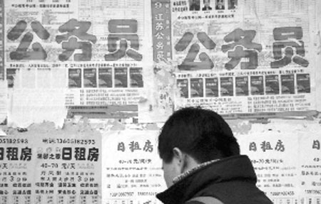 昨天,記者從南京幾所高校校內(nèi)信息公告欄里看到,公務(wù)員考試輔導(dǎo)班大有風(fēng)頭蓋過(guò)考研輔導(dǎo)班的趨勢(shì),連學(xué)生宿舍樓門(mén)口、餐廳門(mén)口公告欄上,也張貼著公務(wù)員考試輔導(dǎo)的招生海報(bào)。