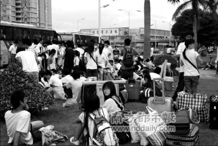 前天下午6時許,記者趕到松崗文化廣場,仍然有100多名學(xué)生滯留在那里。其中一個學(xué)生告訴記者,他們來自廣東輕工職業(yè)技術(shù)學(xué)院,這次共有300多名大一和大二的學(xué)生來深圳打暑期工。同學(xué)們每人交了100元包車費,早上從廣州出發(fā),中午11點多到松崗,卻被廠方告知人員已經(jīng)招滿。