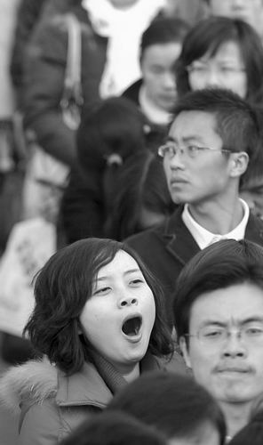 女生一邊等待進(jìn)場(chǎng)一邊打呵欠
