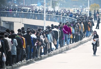 20 日,“湖北省2009年新春大型人才招聘會”在華中科技大學(xué)光谷體育館舉辦。這場招聘會是2009年春節(jié)后首場針對大學(xué)生的招聘會,近4萬名求職者擁向會場,隊伍最長時有3公里。上圖:當(dāng)天下午1時20分,一些學(xué)生投完簡歷走出體育館,而門外還聚集著大量等待進(jìn)場的學(xué)生。