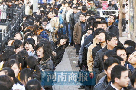 河南工程學(xué)院應(yīng)屆畢業(yè)生小李說(shuō),自己學(xué)的是外貿(mào)英語(yǔ)且是專(zhuān)科,而金融危機(jī)讓外貿(mào)英語(yǔ)招聘崗位又變得十分稀缺。今天好不容易看到有家公司招聘外貿(mào)英語(yǔ)專(zhuān)業(yè)的,但要求有工作經(jīng)驗(yàn),實(shí)在不行,再去上兩年學(xué)。(陳永君)