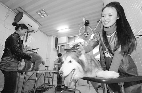 3月31日,寵物美容店店主徐曉娟(右)在為客人的寵物狗美容。2004年,貴州大學(xué)經(jīng)濟(jì)貿(mào)易系的徐曉娟大學(xué)畢業(yè)后選擇自主創(chuàng)業(yè)。她在貴陽市開辦了一家名為“千寵萬愛”的專業(yè)寵物美容店,由于服務(wù)專業(yè)、管理得當(dāng),生意一直不錯(cuò),月收入近萬元。她的寵物美容店也成為大中專畢業(yè)生的實(shí)習(xí)場(chǎng)所,先后有20多位畢業(yè)生來此打工或?qū)W習(xí)。