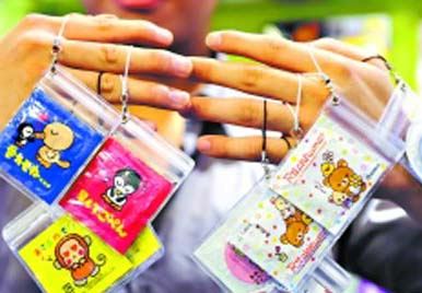 “日韓最新潮掛飾——‘救命兔’,25元/個(gè)”、“超炫辟邪手機(jī)繩,20元/條”……走進(jìn)廣州最多年輕人光顧的幾個(gè)商場(chǎng),隨處可見(jiàn)類(lèi)似的手機(jī)繩廣告。這些手機(jī)繩乍看之下沒(méi)什么特別,但仔細(xì)研究一下會(huì)發(fā)現(xiàn),這些手機(jī)繩上的掛飾竟然都是用安全套做的。