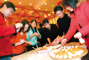 精彩的演出結(jié)束后,所有參加活動的學(xué)生們一起包餃子。因為不少學(xué)生是南方人,包餃子并不在行,餃子的模樣也是五花八門,等餃子煮出來更是皮和餡兒都分了家,大家一邊吃一邊笑,心情很愉快。在南大讀大二的毛靜是個靦腆的重慶姑娘,不愛說話的她也被現(xiàn)場快樂的氣氛感染了,開心地有說有笑,她說,自己家的經(jīng)濟(jì)條件不是很好,又加上下大雪,就沒有回家。自己是個特別內(nèi)向的人,本來以為會度過一個寂寞的假期,但是,豐富的活動和周圍眾多的朋友讓她感到了家一樣的幸福。