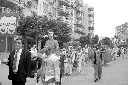 23日上午,數(shù)十名身著中國傳統(tǒng)服飾的婚禮隊伍早早等在西河北路一宿舍小區(qū)。十多名男女扛著木牌,上寫“鐘愛一生”、“喜結(jié)良緣”之類吉辭。兩只彩獅,一條長龍,排在隊伍當(dāng)中。而近20輛人力三輪車,載著新郎、新娘的親屬,跟隨在隊伍后面。