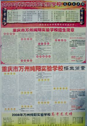 昨日,萬州多所學校老師向本報投訴稱,該區(qū)純陽實驗學校造假,編了一個叫魏來的考生,在報紙上打廣告說他考上了清華大學。記者注意到該招生廣告分兩部分,上面是“2008年純陽學校高考龍虎榜”,下面是招生簡章的具體情況。龍虎榜上是該校今年高考錄取動態(tài),包括學生姓名和錄取院校。其中排在榜首的叫“魏來”,錄取院校是清華大學。廣告在本月14日和16日兩天刊登,一時間純陽實驗學校今年有學生考上清華大學的消息,成為當?shù)睾芏嗉议L和市民的談資。萬州某中學一位不愿透露姓名的中干說,一些家長就此拿著報紙罵他們,有那么多好的生源卻教不出“北大”、“清華”來,他們感到很是委屈。