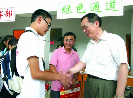 正在王德鑫和王剛填寫表格的過程中,中科大校長(zhǎng)朱清時(shí)院士來到了他們身邊,“歡迎你們來到中科大!”校長(zhǎng)向他們伸出了溫暖的大手。聽說王德鑫和王剛早早就立志考科大,朱校長(zhǎng)高興地說,“我也是四川人,也是早早立志考科大,我是1963年考上的,到現(xiàn)在45年了!痹诹私獾酵醯脉问且粋(gè)人來報(bào)到時(shí),朱校長(zhǎng)連聲夸贊他“了不起”,“現(xiàn)在一個(gè)人來報(bào)到的學(xué)生可不多了,當(dāng)年,我們都是一個(gè)人來學(xué)校的!”在向兩位同學(xué)簡(jiǎn)單介紹了“綠色通道”的報(bào)名程序后,校長(zhǎng)再次祝福他們:“祝愿你們?cè)谥锌拼蟮纳詈蛯W(xué)習(xí)一切順利!”