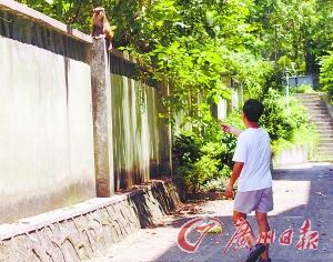 廣東外語外貿(mào)大學(xué)校園東北角是幾棟教工宿舍,隔著圍墻,外面就是郁郁蔥蔥的白云山!按蟾5天前,我看到墻頭上蹲著一只猴子,就回屋拿香蕉過來逗它。它盯著香蕉,又看了我?guī)籽,之后溜下圍墻跳到我身邊,用前爪拍拍我的腿?此蓱z,也多少有點害怕,我把香蕉扔給它,它就自己剝開香蕉吃了!弊≡谶@里的鄭叔告訴記者,這是一只成年猴,個子有70厘米左右,樣子很可憐,一點也不兇。“我在這里住了三十多年了,還頭一回看到猴子下山!