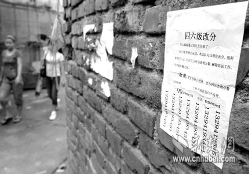 昨日上午,記者接到武昌某大學(xué)學(xué)生的投訴,稱又有人在學(xué)校附近張貼了“四六級(jí)改分”的廣告單。記者前往采訪見到,廣告標(biāo)稱可“解除你找工作、升學(xué)的后顧之憂”,并留下了聯(lián)系電話和QQ號(hào)碼,不時(shí)引來學(xué)生觀看(如圖)。